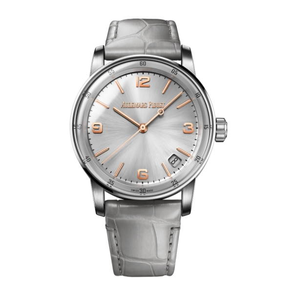 Sự pha trộn giữa vàng trắng và hồng 18 carat của vỏ được bổ sung bởi thiết kế mặt số hai tông màu. Mặt số sơn mài màu xám ánh nắng nổi bật một cách tinh tế bằng các vạch chỉ giờ và kim màu vàng hồng.