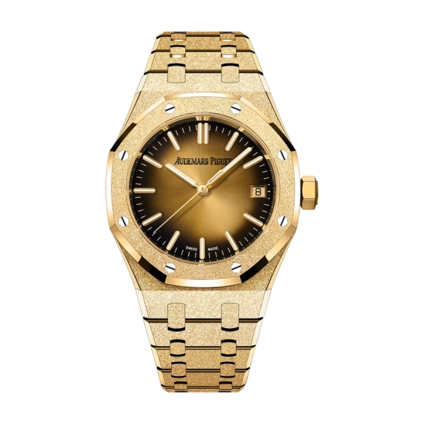 Thiết kế Frosted Gold (Frosted Gold Design): Frosted Gold là một điểm nhấn đặc biệt trong thiết kế của chiếc đồng hồ này. Kỹ thuật đánh búa tạo ra một bề mặt lấp lánh, giúp đồng hồ nổi bật và khác biệt so với các mẫu Royal Oak thông thường. Bề mặt lấp lánh này không chỉ mang lại vẻ ngoài thu hút mà còn tôn lên giá trị của chất liệu vàng 18-carat cao cấp.