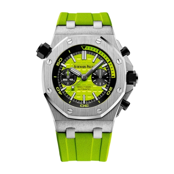 Màu xanh chanh đậm Royal Oak Offshore, pha trộn giữa kỹ thuật thủ công đặc biệt và thiết kế vui nhộn. Mặt số có kiểu “Mega Tapisserie” truyền thống với vạch giờ kép ở vị trí 12 giờ và lớp phủ phát quang giúp hiển thị tốt hơn ở sâu dưới nước. Dây đeo bằng cao su, phối hợp với màu của mặt số, đảm bảo vừa vặn hoàn hảo trên cổ tay.
