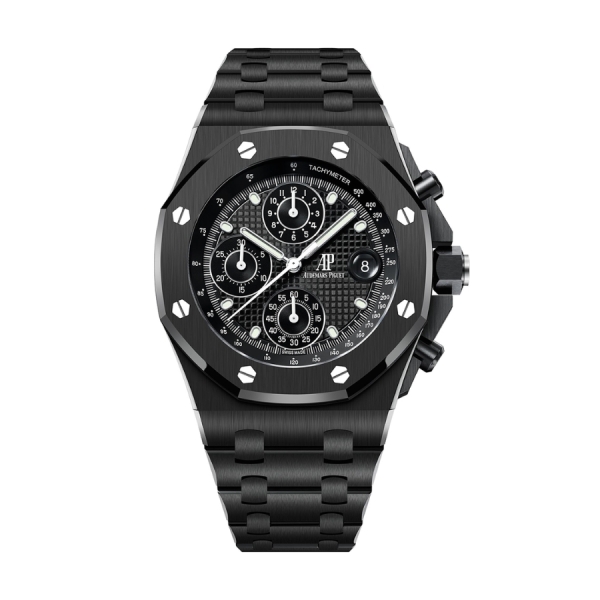 Audemars Piguet Royal Oak Offshore Selfwinding Chronograph 26238CE.OO.1300CE.01 được chế tác từ gốm đen (black ceramic), một vật liệu được ưa chuộng trong ngành đồng hồ cao cấp nhờ vào tính năng nhẹ, bền bỉ và khả năng chống trầy xước. Gốm không chỉ mang lại vẻ ngoài sang trọng mà còn cực kỳ dễ bảo quản, giúp đồng hồ luôn giữ được vẻ mới mẻ dù đã sử dụng lâu dài.