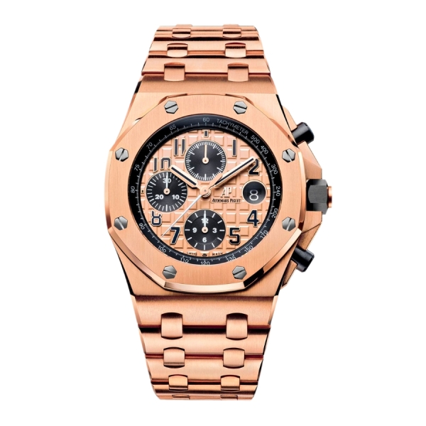 Sự thể hiện đỉnh cao của sự sang trọng không thể chê vào đâu được của Royal Oak Offshore, được trang bị một chiếc vòng tay vàng hồng mịn mượt, được chế tác tuyệt đẹp.