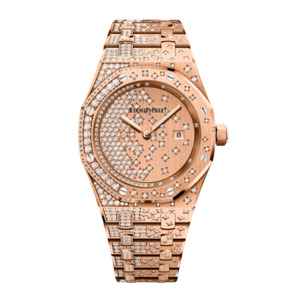 Một thiết kế hướng tới tương lai với những viên kim cương được cắt sáng lấp lánh trên mặt số, khung bezel và vòng đeo tay theo kiểu sóng không đối xứng. Một cách ngẫu nhiên thú vị, những viên đá được tích hợp độc đáo trên bề mặt vàng hồng 18 carat.
