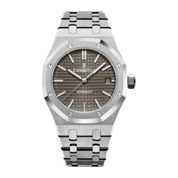 Đồng hồ Audemars Piguet Royal Oak Selfwinding 15450ST.OO.1256ST.02 sở hữu bộ vỏ được gia công bằng chất liệu Thép không gỉ, với dáng mặt số bát giác đặc trưng kích thước 37mm mang tính biểu tượng của dòng Royal Oak được điểm tô cùng vành bezel đính 8 đinh ốc biểu tượng quen thuộc của thương hiệu. Mặt số màu xám ruthenium lấy hoạ tiết “Grande Tapisserie” làm chủ đạo, cùng các vạch chỉ giờ làm bằng vàng trắng và được phủ lớp phát quang. Ô cửa sổ hiển thị ngày ở góc 3 giờ được thiết kế mang đến trải nghiệm xem dễ dàng hơn cho người đeo. Mặt kính chất liệu Sapphire với khả năng chống sốc và chống xây xước tuyệt vời. Dây đeo hoàn toàn bằng Thép không gỉ với khoá gập AP dễ nhận diện.