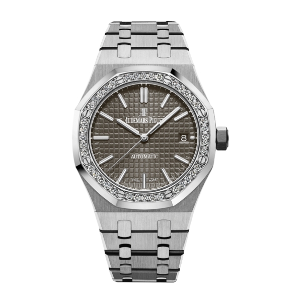 Đồng hồ Audemars Piguet Royal Oak Selfwinding 15451ST.ZZ.1256ST.02 sở hữu bộ vỏ được gia công bằng chất liệu Thép không gỉ, với dáng mặt số bát giác đặc trưng kích thước 37mm mang tính biểu tượng của dòng Royal Oak được điểm tô cùng vành bezel đính kim cương lấp lánh khoảng 0,92 carat. Mặt số màu xám lấy hoạ tiết “Grande Tapisserie” làm chủ đạo, cùng các vạch chỉ giờ làm bằng vàng trắng và được phủ lớp phát quang. Ô cửa sổ hiển thị ngày ở góc 3 giờ được thiết kế mang đến trải nghiệm xem dễ dàng hơn cho người đeo. Mặt kính chất liệu Sapphire với khả năng chống sốc và chống xây xước tuyệt vời. Dây đeo hoàn toàn bằng Thép không gỉ với khoá gập AP dễ nhận diện.