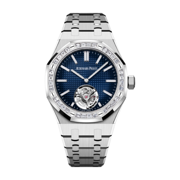 Audemars Piguet Royal Oak Selfwinding Flying Tourbillon Extra-Thin 26660BC.ZZ.1356BC.01 được biết đến với cấu trúc thanh lịch, tinh tế và đẳng cấp. Mặt đồng hồ được tô điểm bằng những viên kim cương baguette cao cấp, viền ngoài vỏ đồng hồ làm từ vàng trắng 18-carat, càng làm nổi bật sự xa hoa và độc đáo của sản phẩm. Kích thước mặt đồng hồ 37mm vừa vặn, phù hợp cho cả nam và nữ, mang đến cảm giác tinh tế, sang trọng nhưng không kém phần nổi bật.