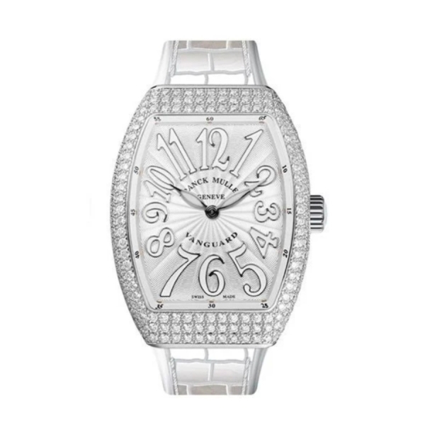Đồng Hồ Franck Muller Lady Vanguard V32 White Custom Full Diamonds Cọc Số Trắng Dây Đeo Trắng