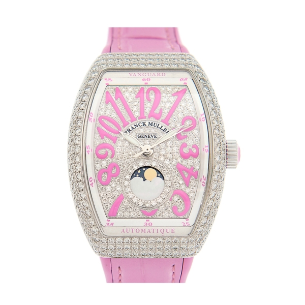 Đồng hồ Franck Muller Vanguard V32 SC AT FO LD CD (AC.RS) là một sản phẩm đồng hồ với lớp vỏ được chế tác từ chất liệu Thép không gỉ cao cấp, có đường kính 32mm và mặt số dáng tonneau (dạng thùng) được Franck Muller khai thác triệt để trong các thiết kế kinh điển của Vanguard, đem lại một tổng thể hoàn hảo và có độ cong hoàn hảo giúp ôm sát cổ tay chủ nhân. Vành Bezel của đồng hồ được hoàn thiện bằng phương pháp đánh bóng quen thuộc, bộ khung bezel đem lại sự mãn nhãn khi được nạm đính kim cương trải dài từ vành bezel vào đến toàn bộ mặt số khiến cho tổng thể đồng hồ trở nên vô cùng thu hút. Franck Muller sử dụng bộ tia, cọc số Ả Rập chỉ giờ quen thuộc đi cùng tính năng moonphase (lịch tuần trăng) được thể hiện qua một mặt số phụ với nửa bán cầu là hình ảnh mặt trăng cùng các vì sao được chạm khắc sinh động tựa như hình ảnh bầu trời đêm.. Đặc biệt, chiếc đồng hồ được tích hợp dây da ca sấu cao cấp mang tone hồng nữ tính phù hợp với các cọc chỉ số. Mặt kính chất liệu Sapphire với khả năng chống sốc và chống xây xước tuyệt vời thể hiện được rõ ràng cỗ máy cơ khí đẹp mắt hoạt động bên dưới.