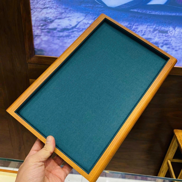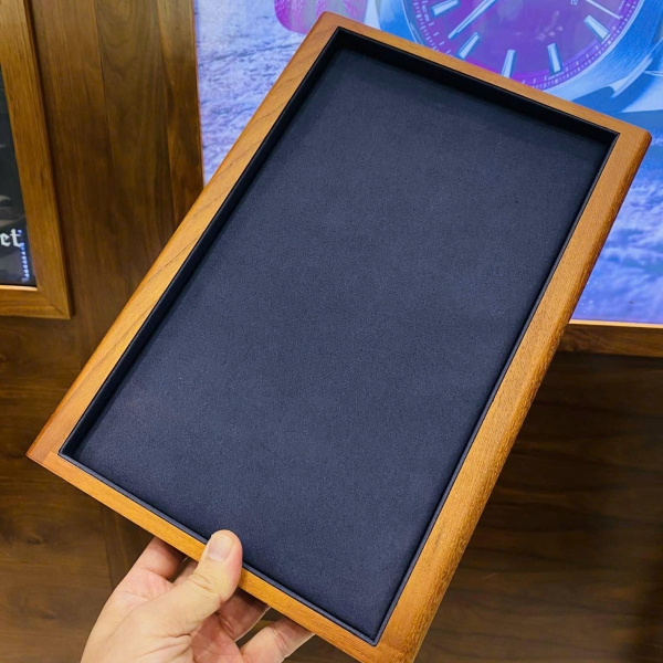 Mẫu khay bày trang sức viền gỗ trơn cực kì sang trọng và chắc chắn rất thích hợp bày đồng hồ, trang sức, phụ kiện cho khách hàng xem hoặc chụp ảnh sản phẩm.